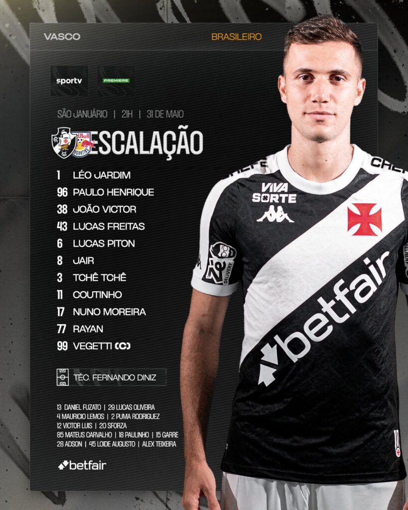 Neste sábado (31), o Vasco enfrenta o Bragantino às 21h, em São Januário, pela 11ª rodada do Brasileirão Série A. O técnico Fernando Diniz decidiu repetir o time que venceu o Melgar, na última terça-feira (27), pela Sul-Americana.