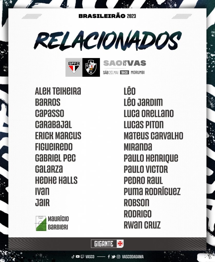 O Vasco divulgou nesta sexta-feira (19), a lista de relacionados para a  partida contra o São Paulo, neste sábado (20), pelo Campeonato Brasileiro. O time titular deve ser o mesmo que entrou em campo contra o Santos.