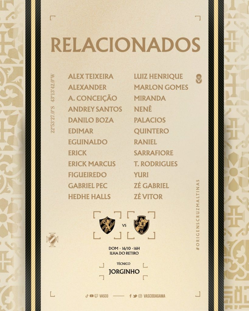 Vasco divulga relacionados para a partida deste domingo