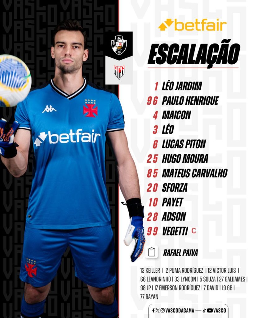 O Vasco está escalado para duelar por 90 minutos com o Atlético-GO, pelas oitavas de final da Copa do Brasil. Sem mudanças significativas, Rafael Paiva botou o que tem de melhor em campo. A surpresa fica com o retorno de Payet aos titulares, no ataque com Adson e Vegetti.