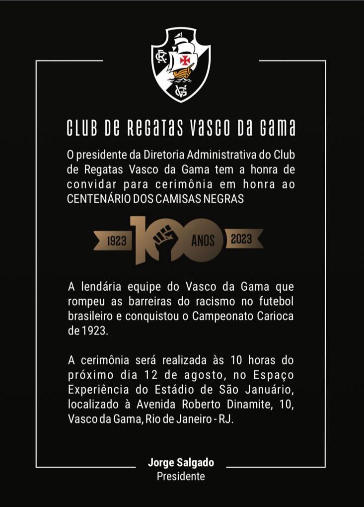 12h Publicação nos veículos oficiais do Vasco de material histórico que conta a saga dos Camisas Negras, com documentos e fotografias ineditas de época. Divulgação do Manifesto “Centenário dos Camisas Negras 1923-2023”.