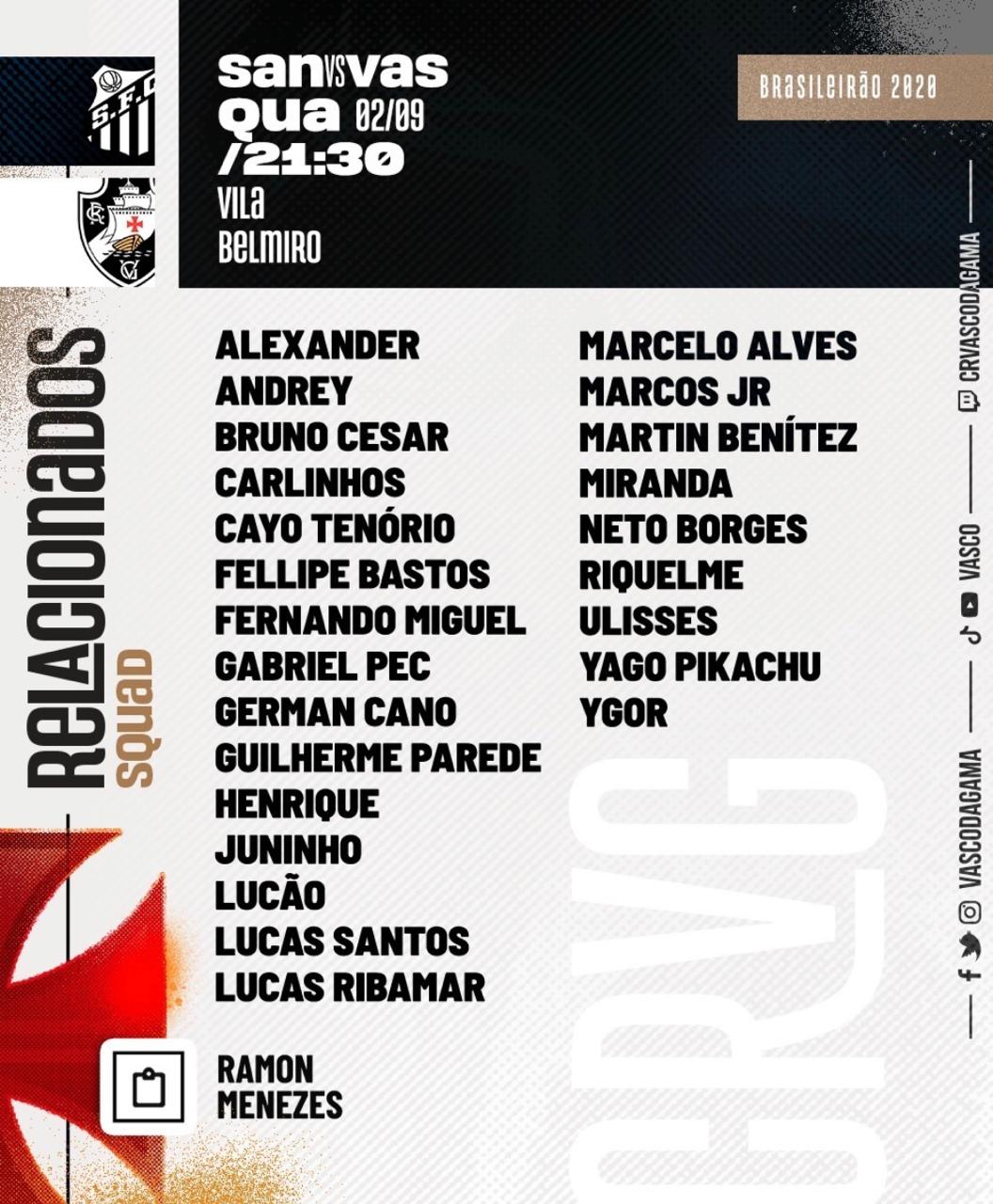O Vasco da Gama tem 6 desfalques para o jogo desta quarta-feira (02/9), às 2130h na Vila Belmiro. Suspenso está o atacante Talles Magno, poupado zagueiro Castan e em quarentena devido a Covid-19 estão fora os zagueiros Ricardo Graça, Werley e Breno, o volante Bruno Gomes é o atacante Vinicius.
