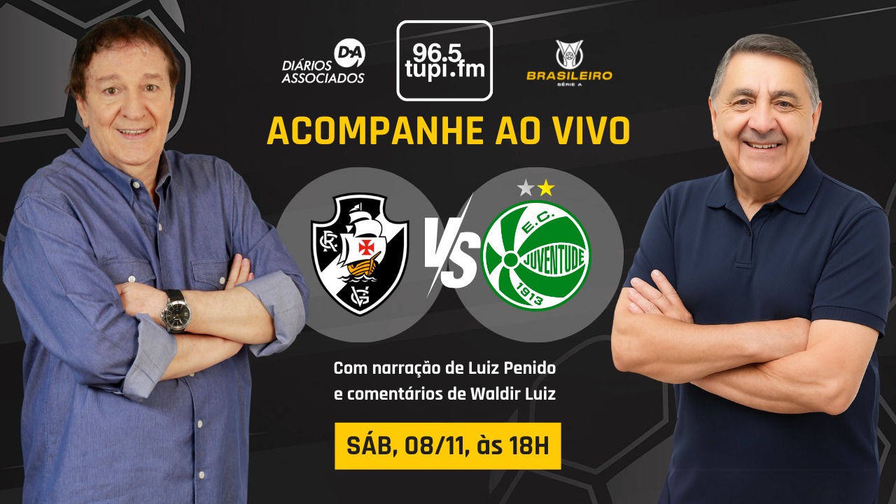 Neste sábado (8), o Vasco recebe o Juventude em São Januário pela 33ª rodada do Campeonato Brasileiro Série A. A Super Rádio Tupi abre a jornada esportiva às 17h, e a bola rola às 18h. A transmissão contará com a narração de Luiz Penido e os comentários de Waldir Luiz. O torcedor vascaíno acompanha todos os detalhes de Vasco e Juventude ao vivo.