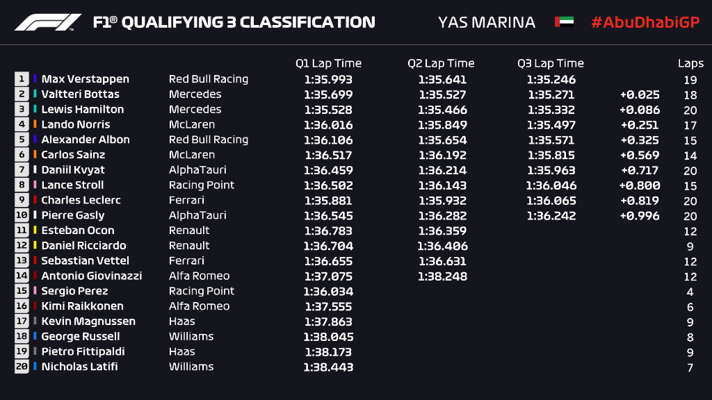 O último treino da temporada de 2020 da Fórmula 1 foi decidido já com o cronômetro zerado e com superação. Max Verstappen, da Red Bull, bateu Valtteri Bottas e Lewis Hamilton para anotar o primeiro tempo num momento em que a pole position seria do finlandês. As voltas rápidas de ambos proporcionou um momento raro com o heptacampeão saindo em terceiro, largando na segunda fila. A corrida será realizada às 10h10 (de Brasília) deste domingo.