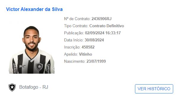 Vitinho foi contratado até 2029 junto ao Burnley, da Inglaterra. O jogador treinou nesta segunda com o restante do elenco. No sábado, ele marcou presença no Estádio Nilton Santos e assistiu à vitória por 2 a 0 diante do Fortaleza.