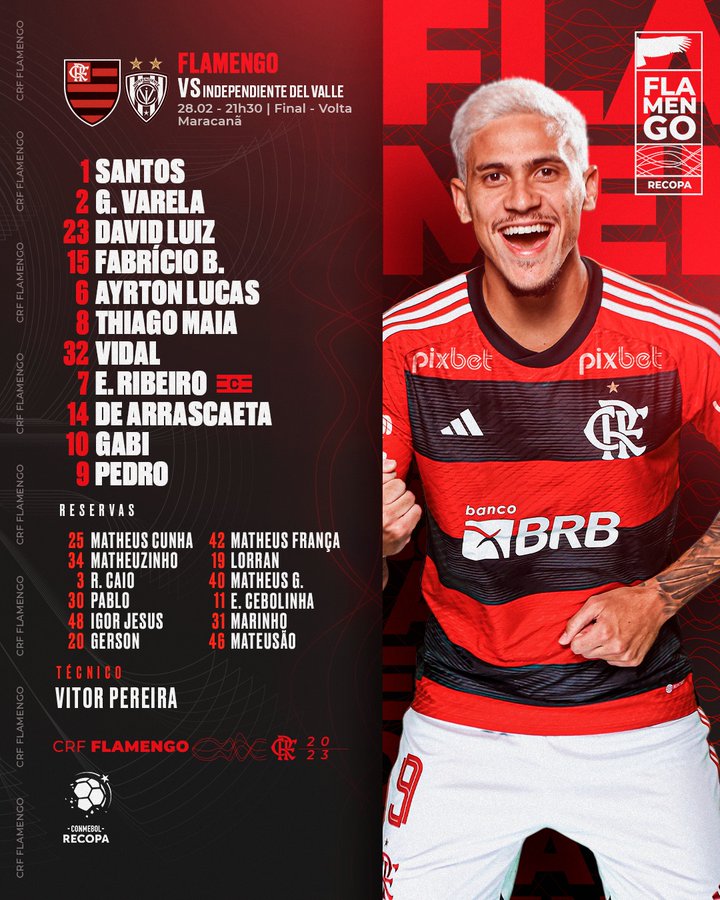 O Flamengo está definido para enfrentar o Independiente Del Valle, daqui a pouco, às 21h30, no Maracanã. O técnico Vítor Pereira mantém Gerson no banco e repete a escalação do jogo de ida. A Super Rádio Tupi transmite a partida com narração de Luiz Penido e comentários de Washington Rodrigues.