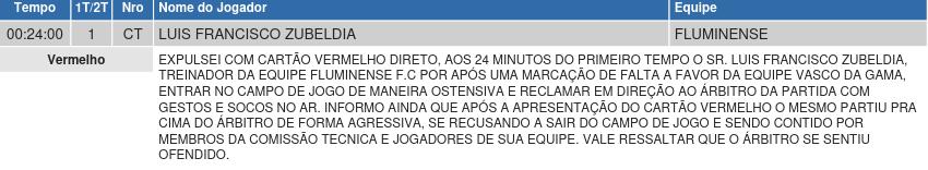 zubeldía também foi denunciado no artigo 243-F (Ofender alguém em sua honra, por fato relacionado diretamente ao desporto), parágrafo primeiro. A pena mínima prevista será de suspensão por quatro partidas, além de multa de R$ 100 a R$ 100 mil. Veja o que foi relatado na súmula pelo árbitro Jodis Nascimento de Souza, que foi convocado como testemunha.