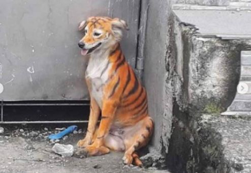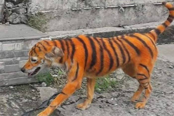 A pintura de animais de estimação estão cada vez mais frequentes e, dessa vez, um cachorro foi avistado andando nas ruas da Malásia com os pelos tingidos de laranja e listras pretas, como se fosse um tigre.