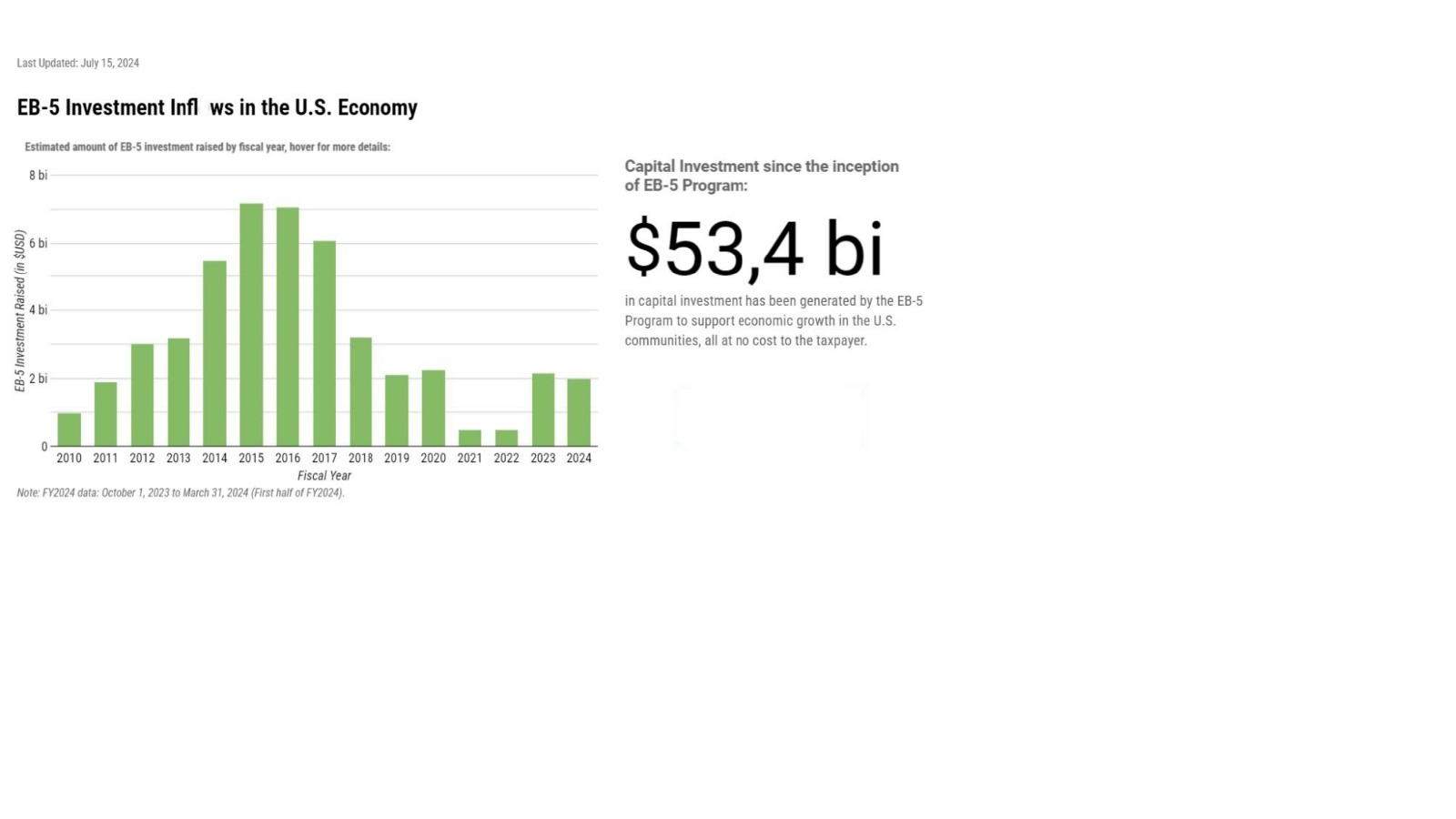 Em julho de 2024, o governo americano divulgou novas estatísticas e demostrou que outra categoria de visto cresceu muito: foi emitido o segundo maior volume mensal de vistos EB-5. Trata-se do visto destinado a investidores e suas famílias que disponham de US$ 800 mil para aportarem nos EUA. O U.S. Citizenship and Immigration Services (USCIS) processou um total de 1.276 casos I-526, durante o primeiro trimestre do ano fiscal de 2024. Os candidatos da China e do Vietnã constituem os grupos que receberam o maior número de vistos EB-5, representando 61% e 19%, respectivamente, do total de emissão de vistos até agora no atual ano fiscal. Desde 2010, o programa EB-5 já acumulou US$ 53,4 bilhões. O governo americano destaca que são recursos para o desenvolvimento do país e que não impactam o bolso do contribuinte americano.