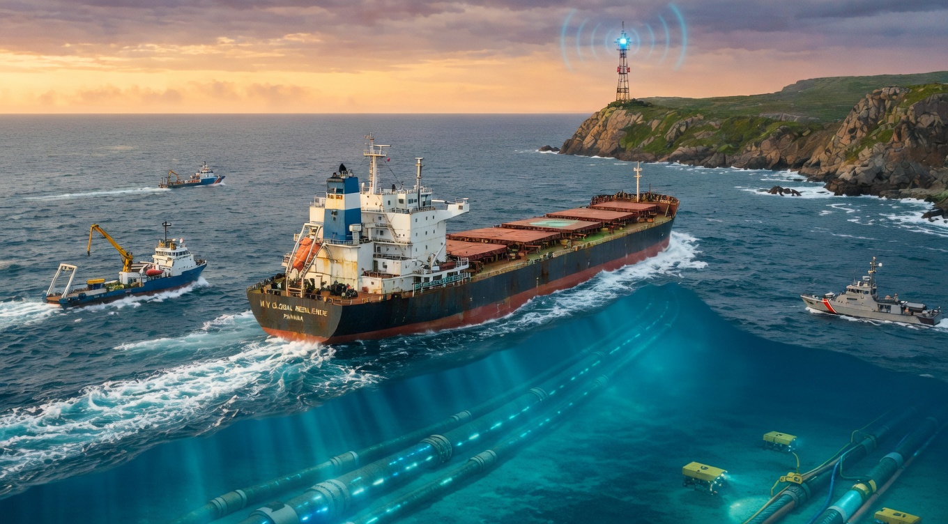 Navio e cabos submarinos ilustram infraestrutura crítica digital