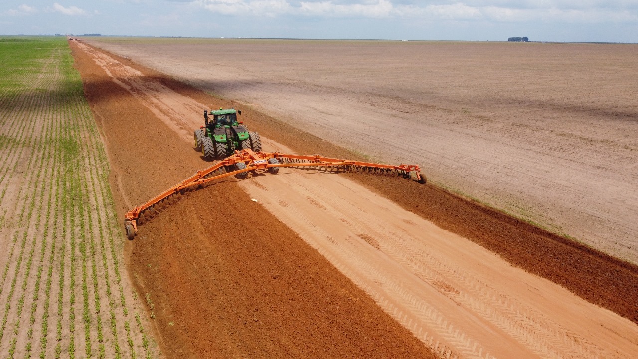 “Um dos destaques da iniciativa é a parceria que trouxe um trator John Deere 9R, com 640 cavalos de potência, que traciona um terraceador de 56 discos. Esse equipamento proporciona uma terraplanagem eficiente, garantindo uma base de estrada com 20 metros de largura”, explica Daniel Ferraz, gerente administrativo e financeiro do Agronegócio Estrondo.