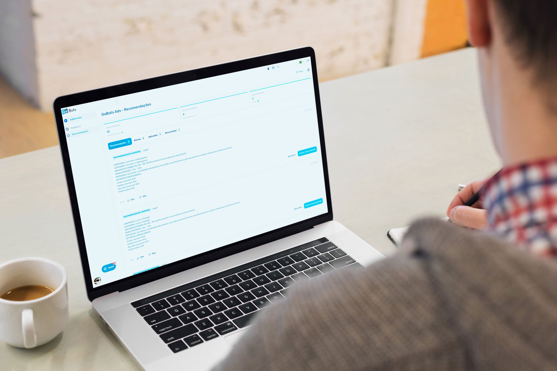 Funcionando como uma consultoria de performance automatizada, a tecnologia monitora as contas dos vendedores continuamente. A IA analisa o cenário, interage com o algoritmo do marketplace e sugere ajustes para reduzir o Custo de Publicidade sobre Vendas (ACOS) e elevar o Retorno Sobre o Investimento em Publicidade (ROAS).