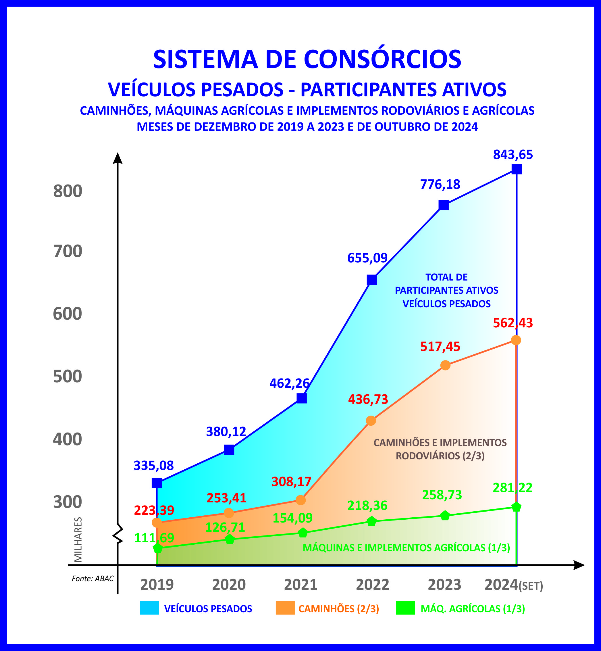 A análise dos totais de participantes ativos do consórcio de veículos pesados no período compreendido de dezembro de 2019 até outubro deste ano, registrou avanço de 151,8%, saltando de 335,08 mil, naquele ano, para 843,65 mil, até 2024.