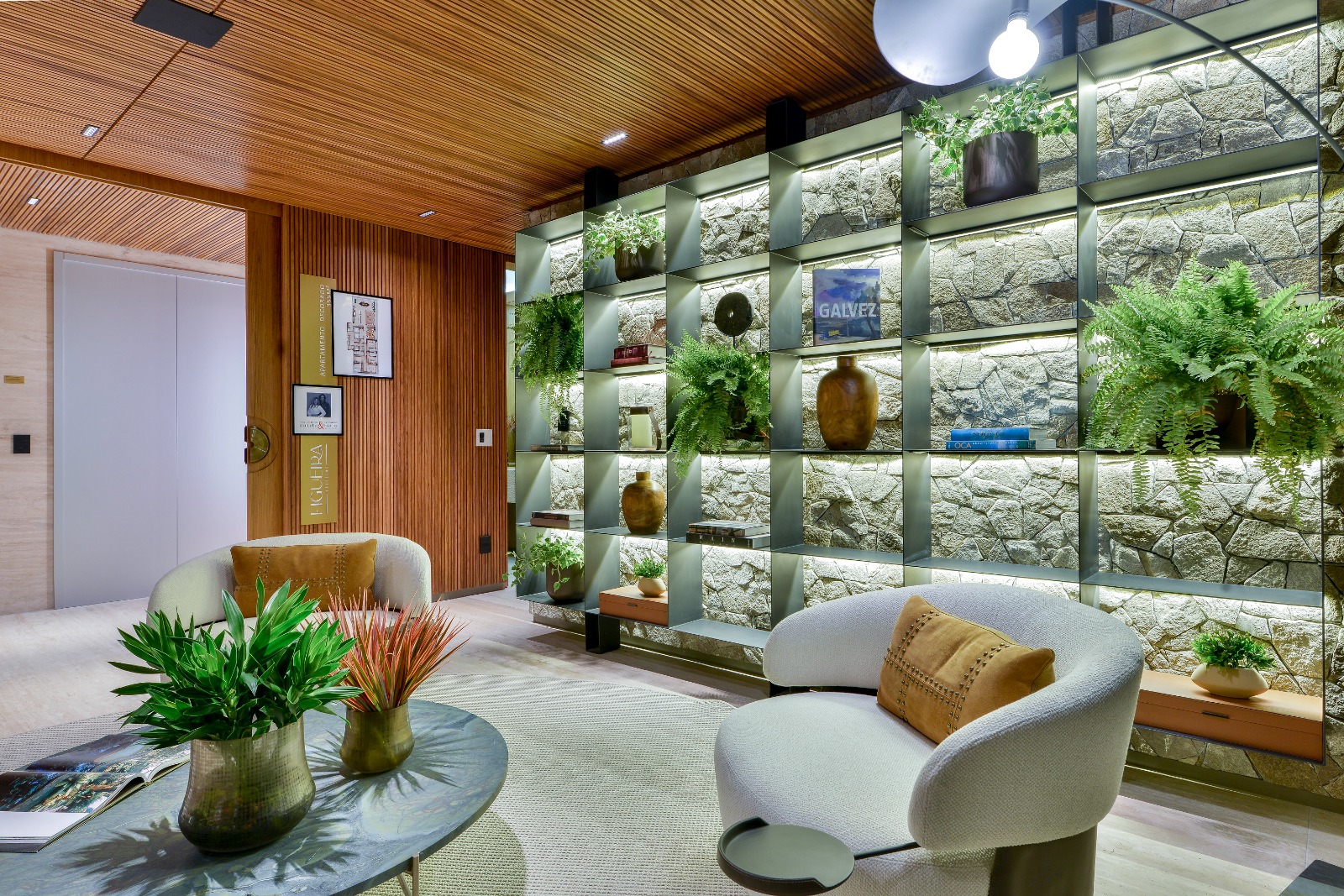 Com projeto de decoração elaborado por Quitete & Faria, e conceito inspirado nas tendências atuais da arquitetura e decoração de alto padrão, cada espaço foi planejado para promover a integração entre os cômodos e maximizar o bem-estar daqueles que estão em busca de um novo lar. Na entrada, uma adega climatizada envidraçada permite a passagem de luz e visão entre os outros ambientes. O living, a sala de jantar, a cozinha e o espaço para plantas, com uma estante metálica e uma parede de pedra Moledo, são integrados e formam uma área social de convivência.