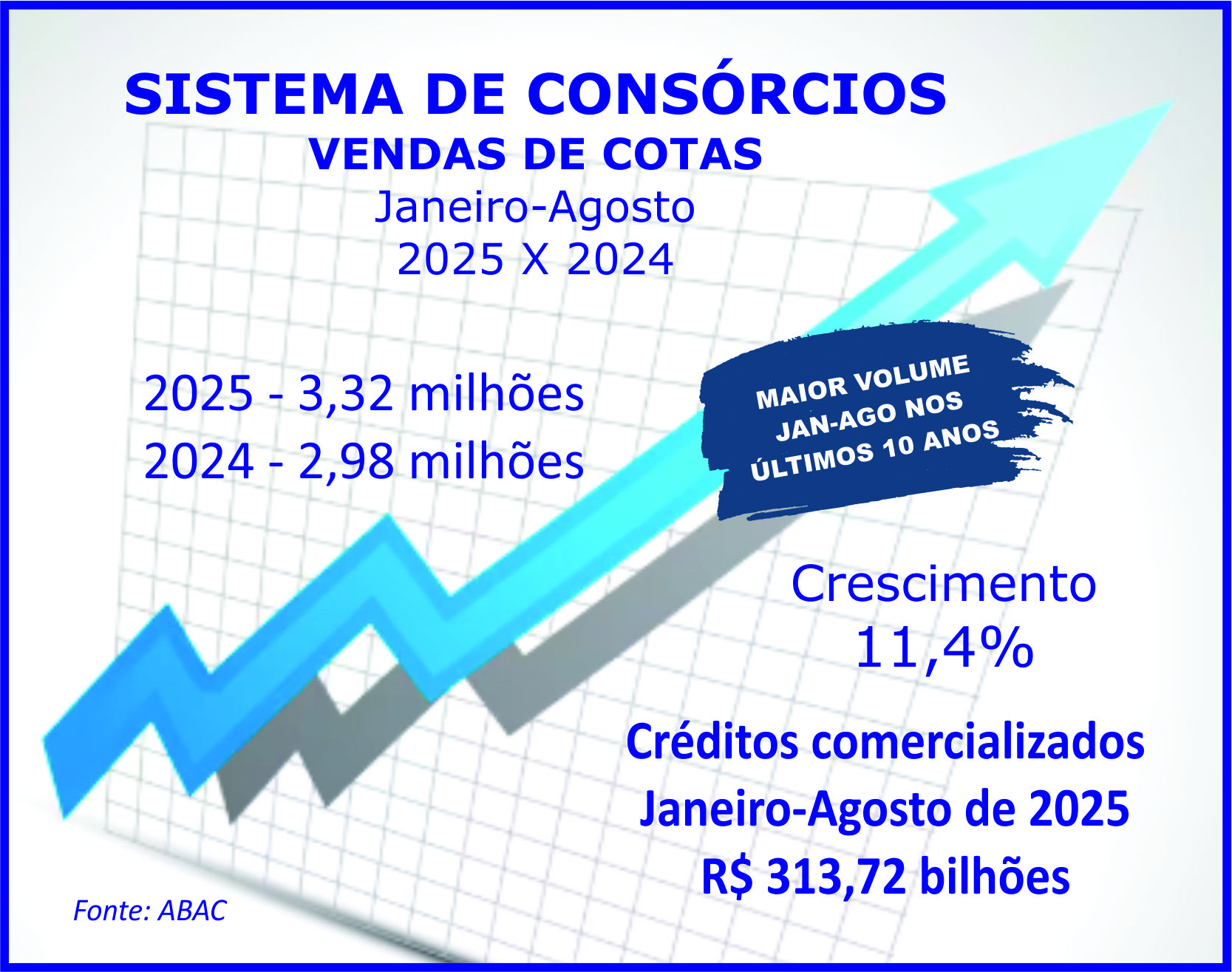 O Sistema de Consórcios alcançou em agosto marcas inéditas em seus indicadores geral e setoriais. Ao atingir 3,32 milhões de adesões no acumulado de janeiro a agosto, avançou 11,4% sobre as 2,98 milhões do mesmo período relativas ao ano passado. Os negócios decorrentes destas vendas somaram R$ 313,72 bilhões, 24,6% maior que os R$ 251,81 bilhões de um ano atrás, de acordo com as estimativas levantadas pela assessoria econômica da Associação Brasileira de Administradoras de Consórcios (ABAC), junto às suas associadas.