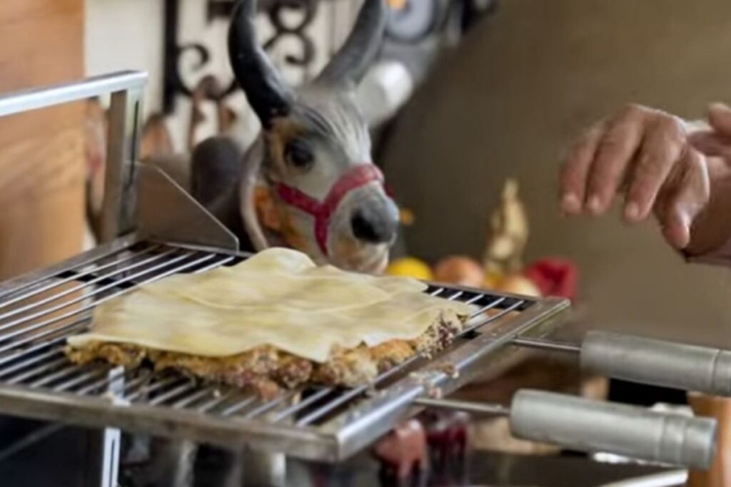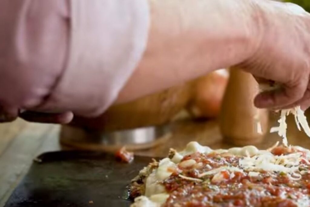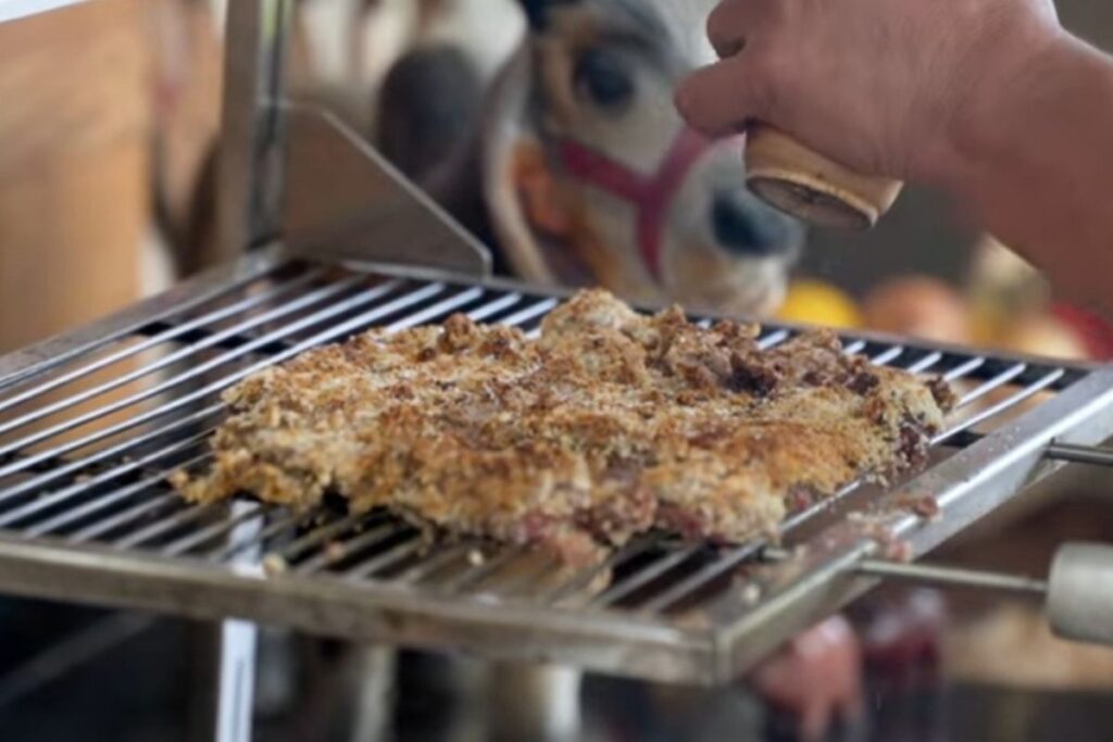 De terno, gravata, e avental, o criador de conteúdo recebe os clientes do restaurante – seus familiares – e explica para elas como funciona. “Deixa o cartão do lado verde se quiserem carne e do lado vermelho se não quiserem mais”, diz a elas.