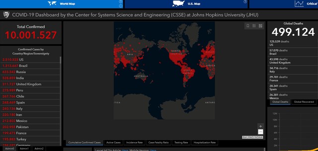 Mundo ultrapassa 10 milhões de infectados, diz universidade americana