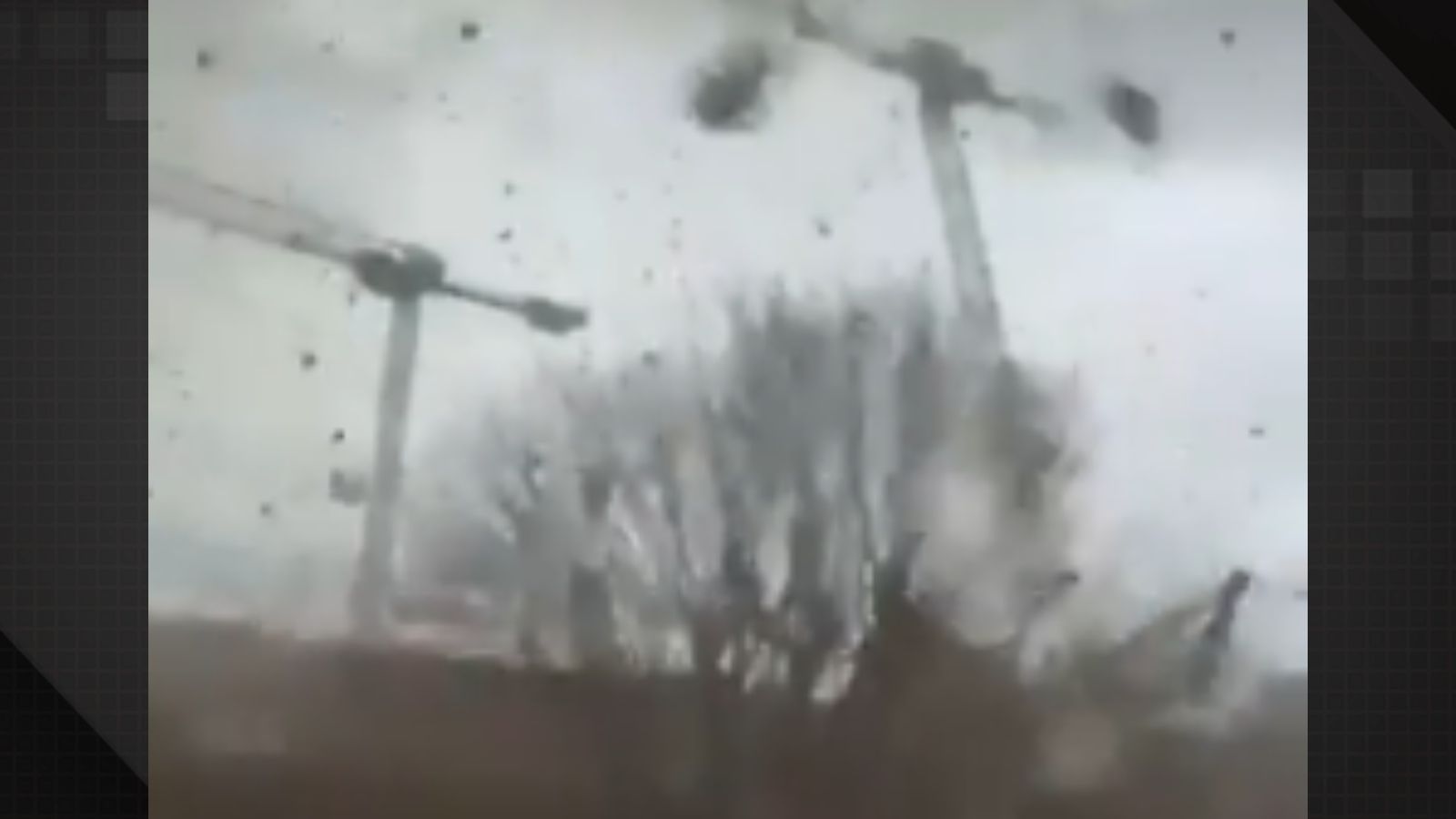 As fortes rajadas de vento derrubaram três guindastes posicionados no centro da cidade, provocando cenas de desespero entre os moradores.