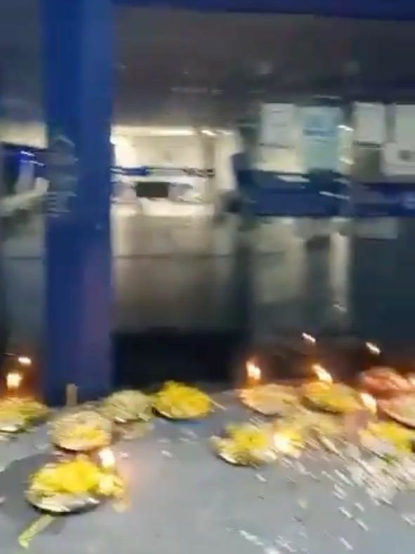 Um vídeo viralizou nas redes sociais: quase 20 ofertas religiosas foram colocadas durante a madrugada desta quinta-feira (7) na porta da Agência Caixa Econômica Federal de Vila Valqueire, na Zona Oeste da cidade.