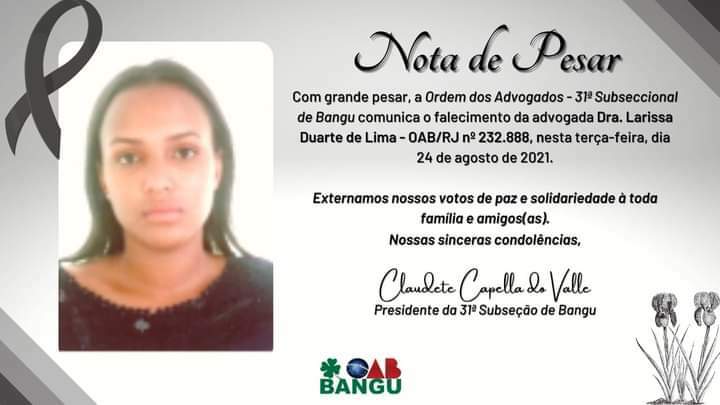 A Ordem dos Advogados do Brasil (OAB) em Bangu, divulgou uma nota de pesar.