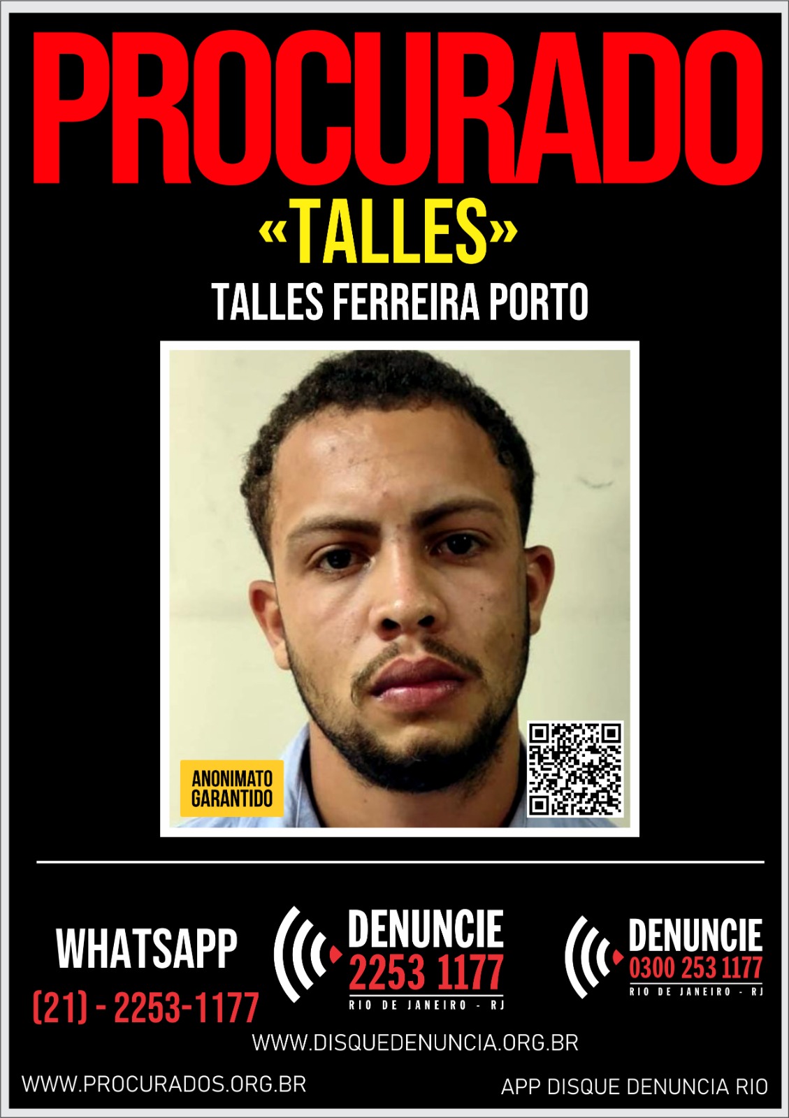 O Disque Denúncia divulgou neste sábado (02) um cartaz a fim de obter informações que levem à prisão de Talles Ferreira Porto, de 23 anos.