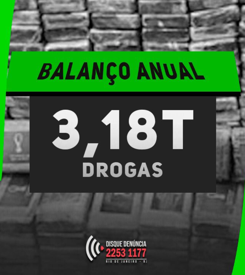 De janeiro a dezembro de 2023, o programa Disque Denúncia registrou 77 mil denúncias anônimas sobre variados crimes, em todo o estado do Rio de Janeiro. As informações vindas da população ajudaram às instituições policiais na apreensão de 3,18 toneladas de drogas, o dobro em relação ao ano anterior e 3,2 toneladas de barricadas que impediam a passagem de carros e de pedestres foram retiradas das ruas, um número três vezes maior do que no ano de 2022.