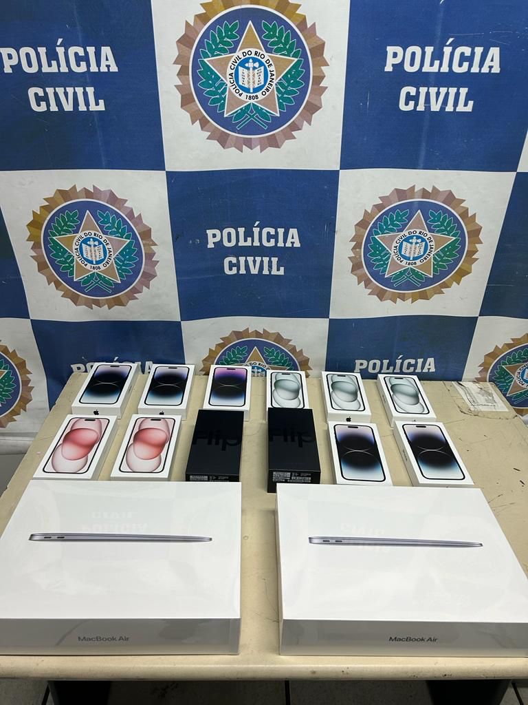 Na ação foram apreendidos cinco IPhones 14 e cinco iPhones 15, dois Samsung Galaxy Z Flip 4 e dois MacBooks Air