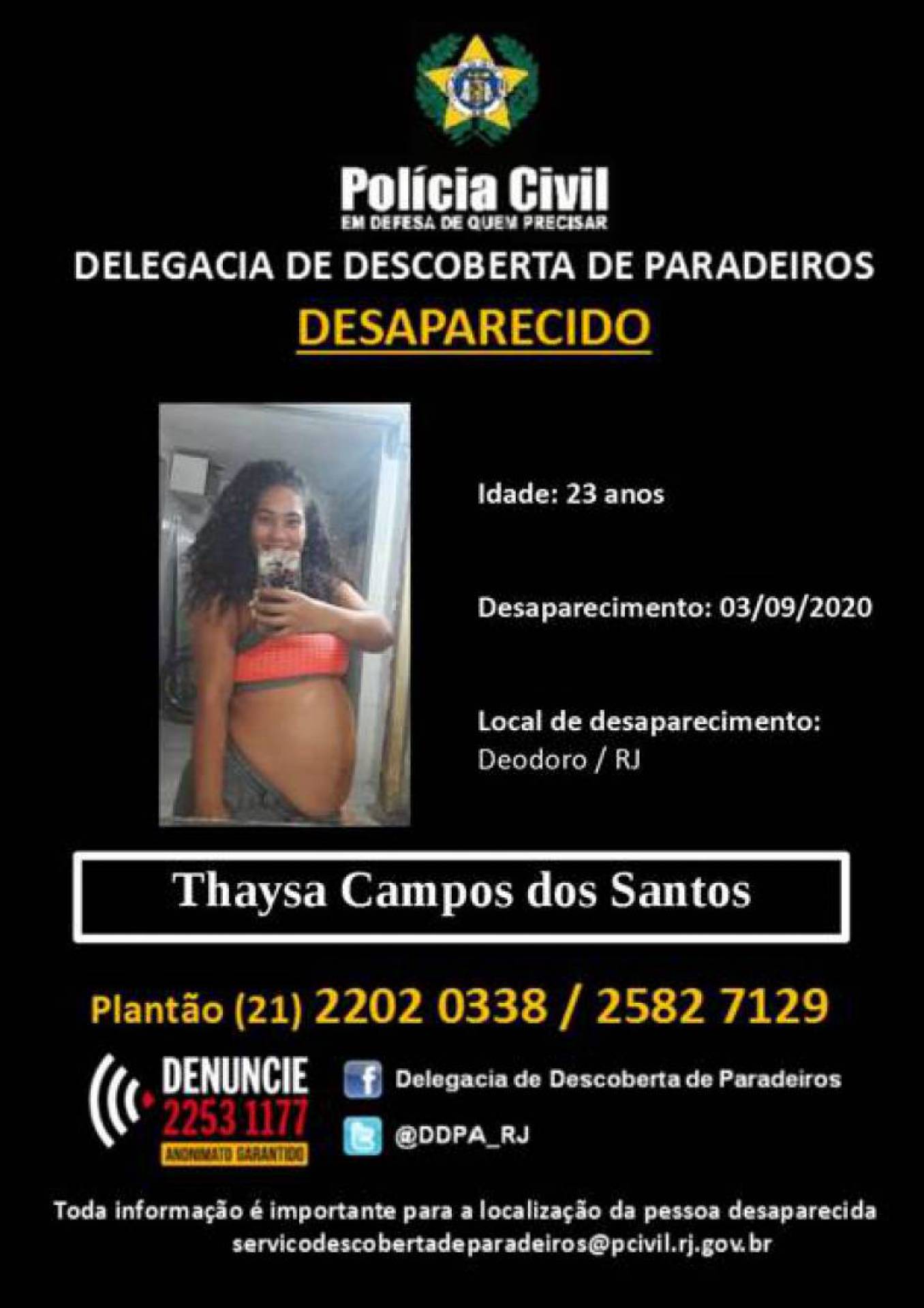 A Polícia Civil está investigando o desaparecimento de Thaysa Campos dos Santos, de 23 anos. A jovem está grávida de oito meses, com parto previsto para outubro e foi vista pela última vez na quinta-feira, dia 3 de setembro, após sair de casa, em Deodoro, na Zona Oeste da cidade, que divide com uma amiga. As investigações estão com a Delegacia de Descoberta de Paradeiros.