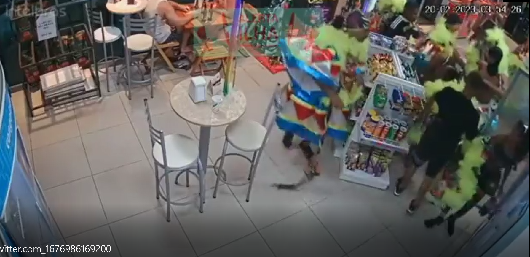Pelo vídeo da câmera de segurança, é possível ver um grupo de mais de 10 pessoas fantasiadas entrando e saindo do estabelecimento comercial para pegar bebidas e comidas.