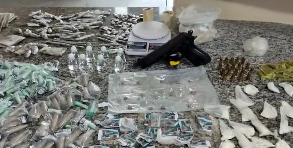 Os policiais apreenderam também 152 cápsulas de cocaína, 158 trouxinhas de maconha, 14 câmeras, oito frascos de loló, 14 comprimidos de ecstasy e 26 pedras de crack, além de outros equipamentos utilizados na central de monitoramento.