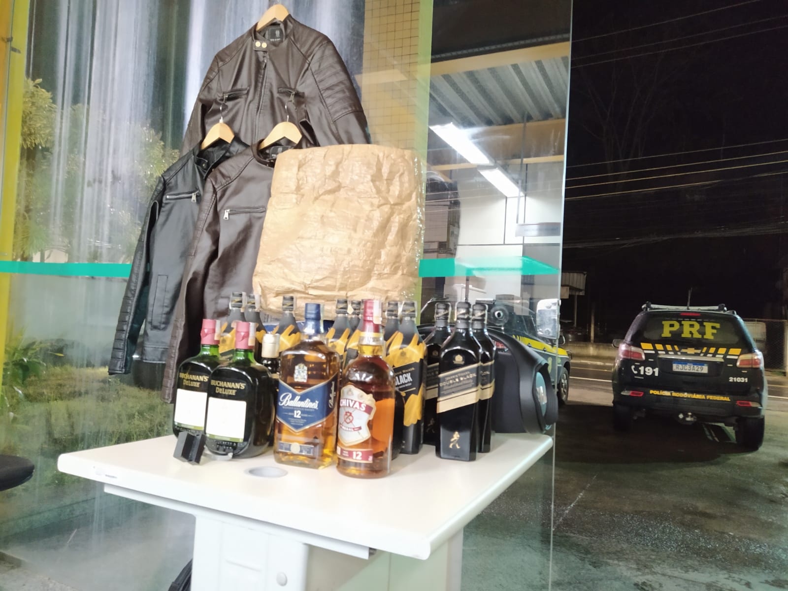 Ao revistar o veículo, foram encontradas 18 garrafas de whisky, peças de roupa, uma caixa de som e quatro caixas de bacalhau, sem nota fiscal.