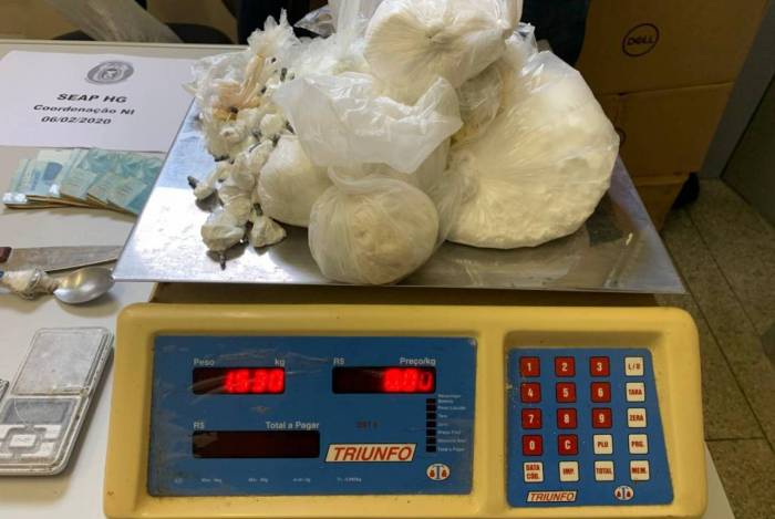Foram apreendidos 19 aparelhos celulares, cerca de um quilo e meio de cocaína, aproximadamente 900 gramas de maconha; 16 comprimidos de cor azul, não identificados, uma faca; uma balança de precisão; um relógio de pulso; e R$ 3 mil em espécie.