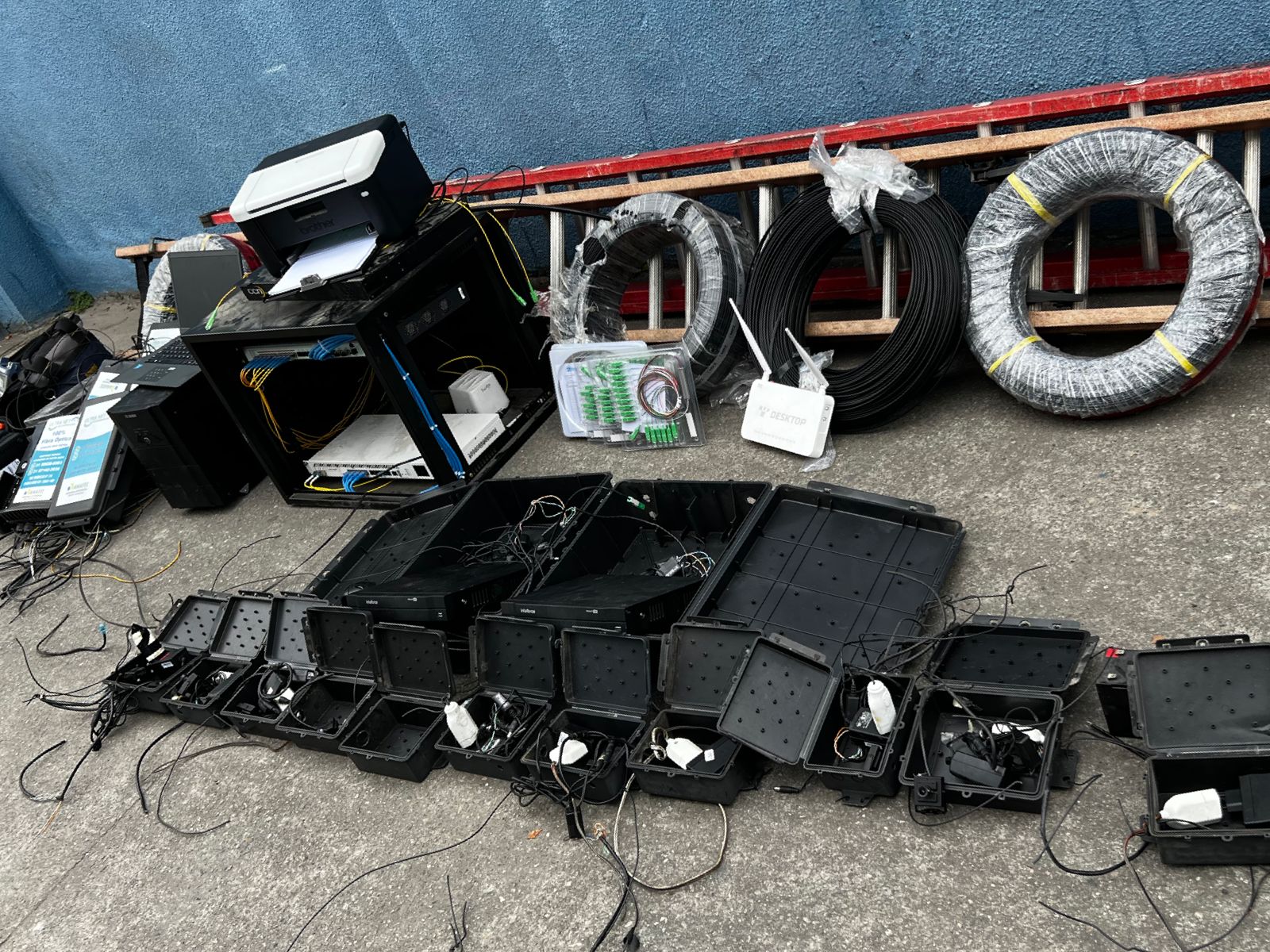Ainda na ação, um local de distribuição de sinal clandestino de internet foi encontrado e houve apreensão de dez roteadores, seis caixas de passagem, dois aparelhos de armazenamento, três equipamentos de potência métrica de fibra óptica, dois equipamentos de solda de fibra óptica, 200 metros de cabos telefônicos, um notebook, uma impressora e duas escadas.