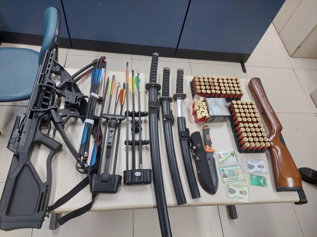 Na residência do acusado foram encontradas 125 munições de calibre 12, três espadas tipo ninja (catanas), um facão de mata, uma besta (tipo de arco flecha) em forma de espingarda e 12 flechas apropriadas para tal arma.