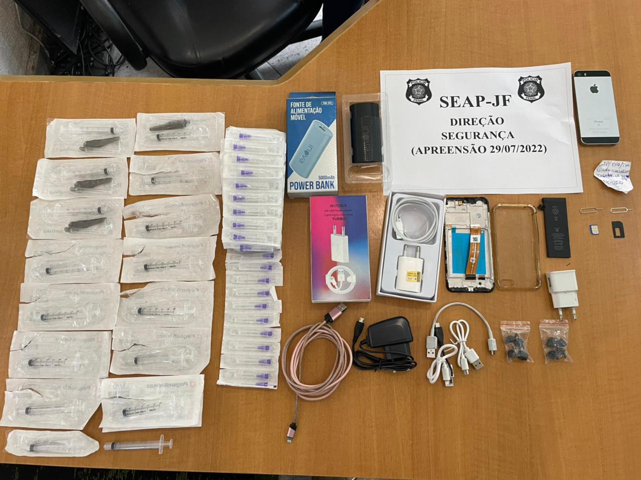 Após a descoberta do celular, policiais penais do presídio Joaquim Ferreira de Souza de Santos, revistaram o armário pessoal de Santos, onde foram encontrados 100 agulhas tamanho 24×3, 16 seringas, um carregador portátil de celular, um carregador Power adapter, uma tela de celular, quatro cabos de carregador, quatro pares de capas de fones de ouvido, uma capa de celular, um porta chip e duas chaves porta chip.