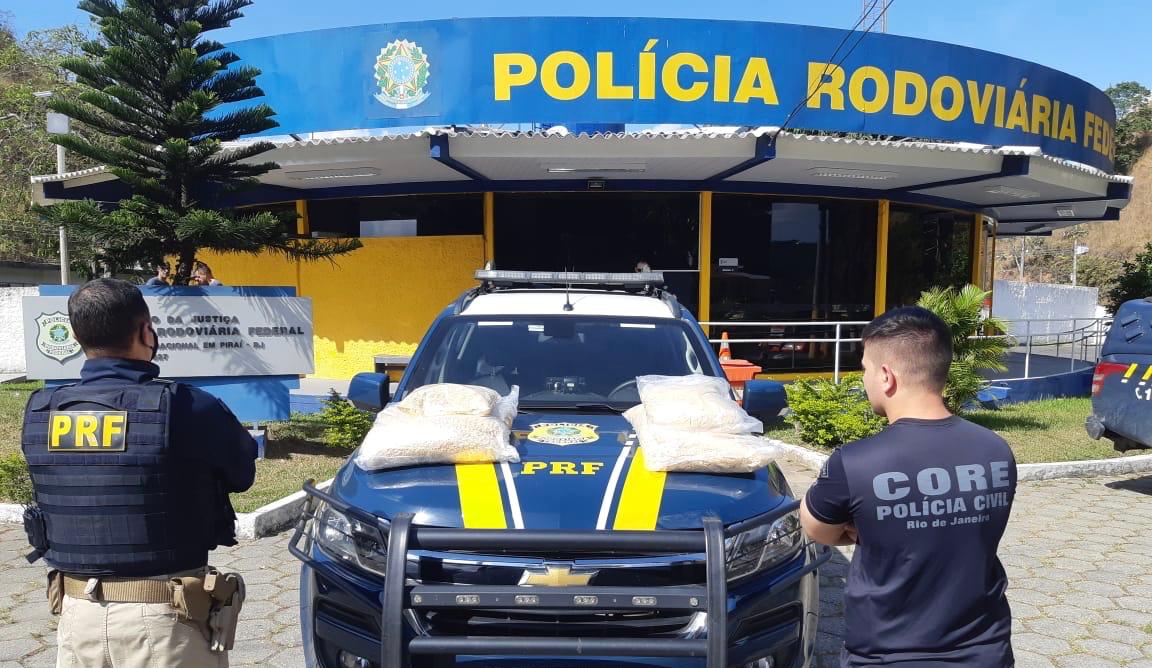 Policiais Civis da Coordenadoria de Recursos Especiais (Core) e agentes da Policia Rodoviária Federal (PRF) apreenderam cerca de 50kg de pasta base de cocaína no KM 227 da Dutra, posto PRF de Caiçara, no início da descida da Serra das Araras, em Piraí, no Sul Fluminense do Rio.