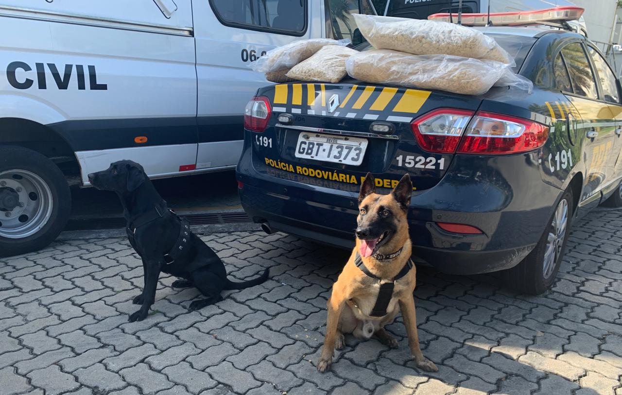 No porta-malas de um dos veículos, os policiais encontraram sacos de ração animal e, no interior de alguns deles, invólucros contendo pasta base de cocaína, com peso estimado de 50 kg. Durante a ação foram utilizados cães de faro do canil da CORE.