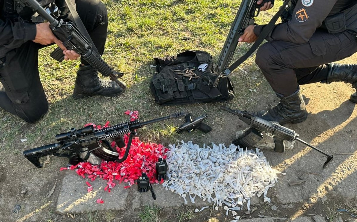 Na operação, foram apreendidos grande quantidade de drogas, dois fuzis, uma pistola e rádios comunicadores.