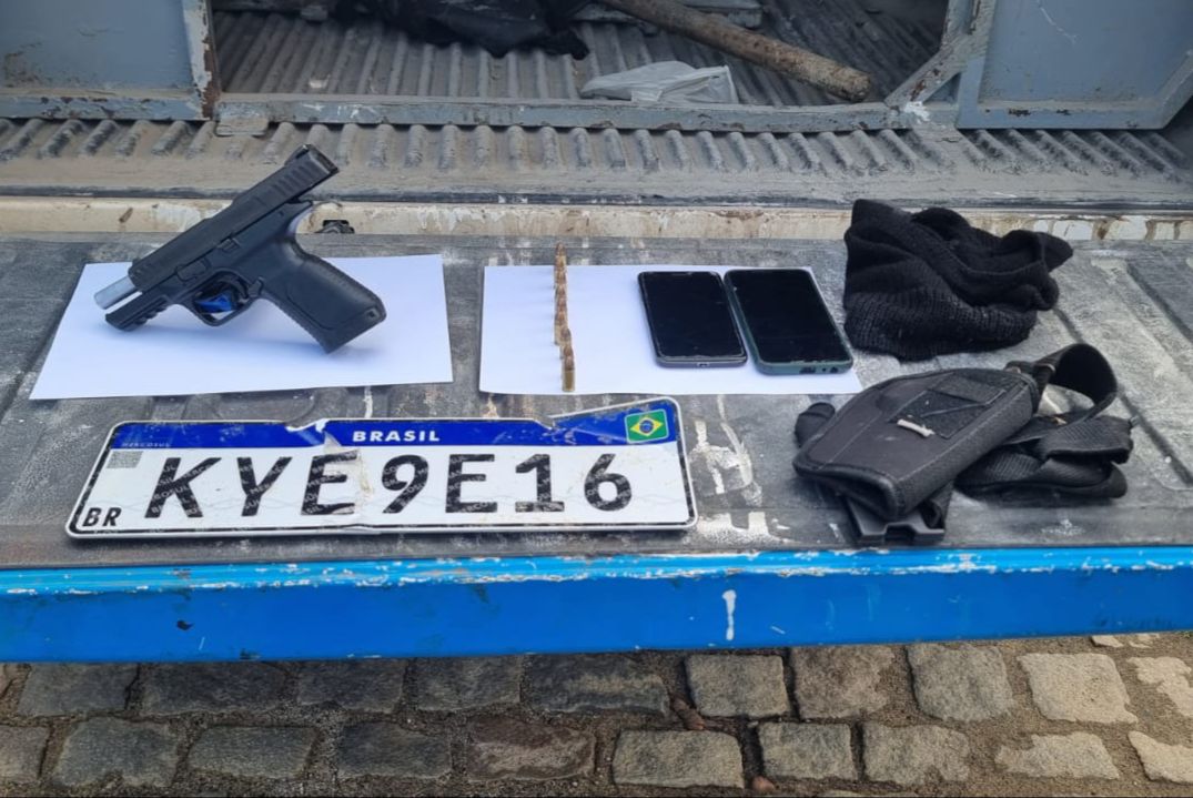 Dentro do veículo, foi apreendida uma pistola 9mm, um carregador de pistola e dois aparelhos celulares