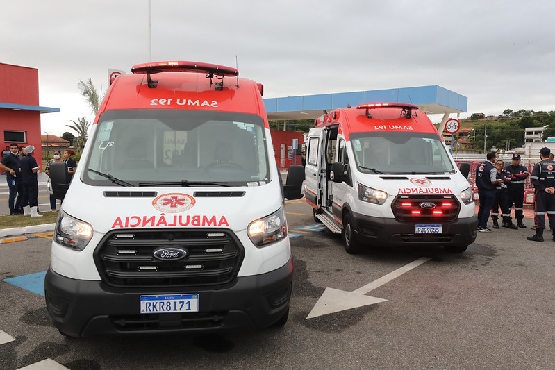 Cláudio Castro também entregou duas ambulâncias do Serviço de Atendimento Móvel de Urgência (SAMU) em Maricá. Ao lado do secretário de Estado de Saúde, Dr. Luizinho, Castro já entregou 207 ambulâncias em 66 municípios do Rio de Janeiro.