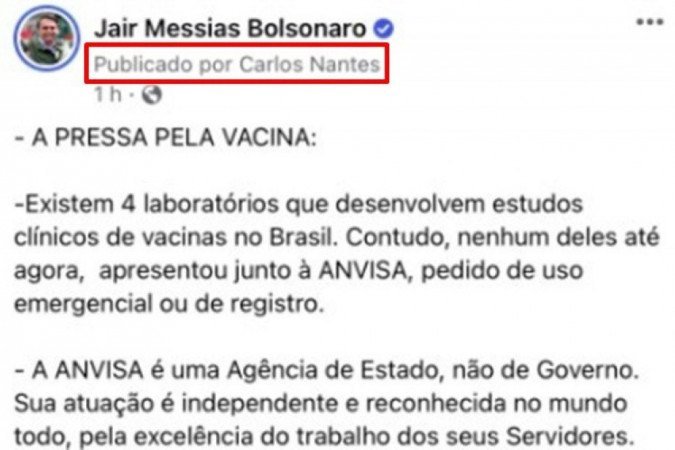 A imagem publicada no Twitter do presidente é uma captura de tela de uma postagem feita na conta oficial de Bolsonaro no Facebook. Porém, o print foi feito por algum administrador da página. Assim, logo abaixo do nome da página, aparece a identificação do usuário que criou a postagem. No caso, Carlos Nantes, o filho vereador do presidente, cujo nome completo é Carlos Nantes Bolsonaro.