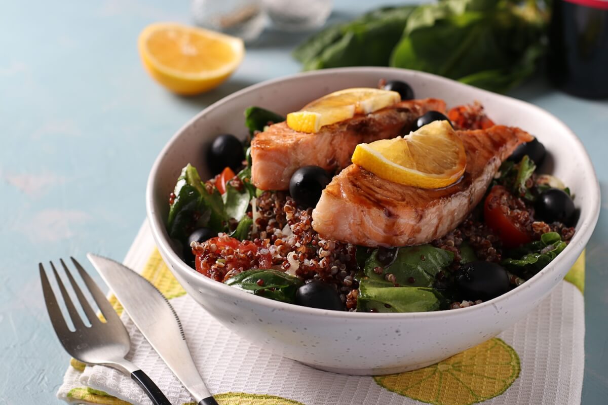 Em um recipiente, tempere o salmão com sal, pimenta-do-reino e suco de limão. Grelhe os filés em uma frigideira antiaderente untada com azeite em fogo médio até dourar por fora e ficar macio por dentro. Depois, em uma tigela, misture a quinoa cozida com o espinafre, os tomates-cereja e as azeitonas. Tempere com sal, pimenta-do-reino e azeite. Sirva o salmão sobre a salada e decore com as fatias de limão-siciliano.