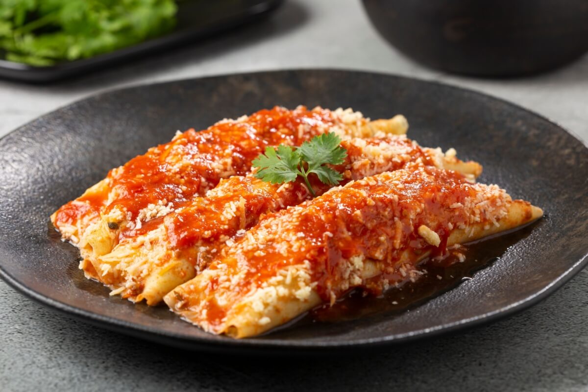 Coloque o recheio de carne moída no centro da panqueca e enrole. Repita esse processo com todos os discos de panqueca. Depois, transfira as panquecas para uma travessa, regue com o molho de tomate e salpique com o queijo ralado. Leve ao forno preaquecido a 200 °C por 5 minutos. Sirva em seguida.