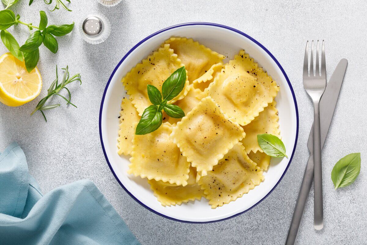 Em uma panela, coloque a água e leve ao fogo médio até levantar fervura. Depois, com uma escumadeira, disponha, aos poucos, os raviolis e cozinhe até emergirem à superfície. Retire-os da panela e sirva em seguida.