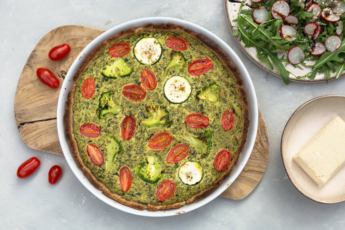 Por último, coloque o fermento químico e bata novamente para incorporar. Transfira a mistura para a panela com o brócolis e misture. Após, disponha o recheio sobre a massa, espalhe e finalize com os tomates-cereja e as rodelas de abobrinha. Leve ao forno preaquecido a 180 °C por 20 minutos. Sirva em seguida.