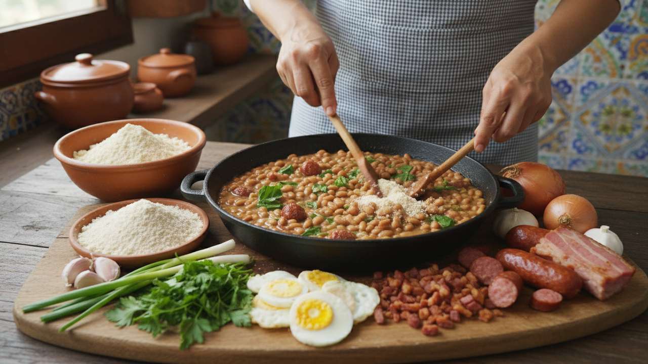 O preparo do feijão tropeiro clássico costuma seguir uma sequência simples, mas alguns cuidados fazem diferença no resultado final. Uma panela ampla de fundo grosso ajuda a dourar as carnes de forma uniforme e a misturar os ingredientes sem quebrar os grãos de feijão. Em linhas gerais, o processo envolve três etapas: cozinhar o feijão, fritar as carnes e montar o prato com a farinha e os temperos.