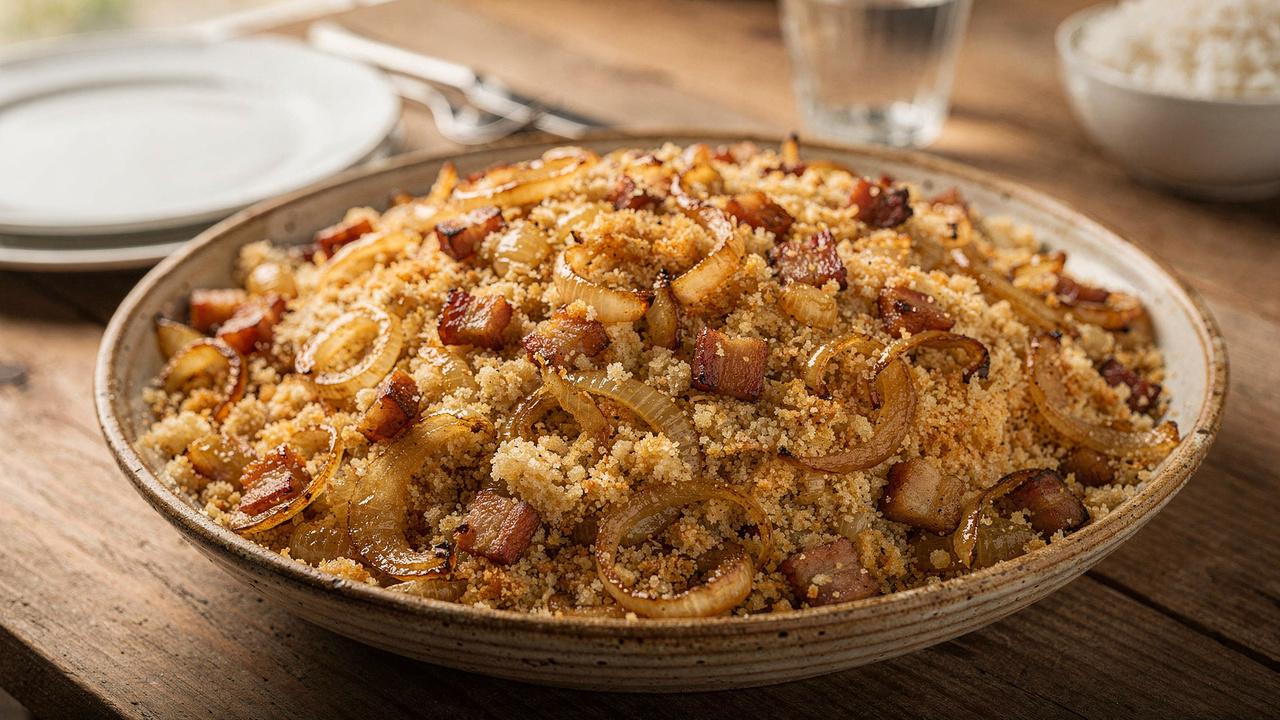 A farofa de cebola e bacon aparece com frequência em mesas brasileiras nas mais diversas ocasiões. Do churrasco de fim de semana ao almoço de família, esse acompanhamento crocante e dourado costuma atrair a atenção pelo aroma característico e pela combinação de sabores marcantes, unindo a doçura da cebola caramelizada ao toque salgado do bacon e à textura granulada da farinha de mandioca grossa.