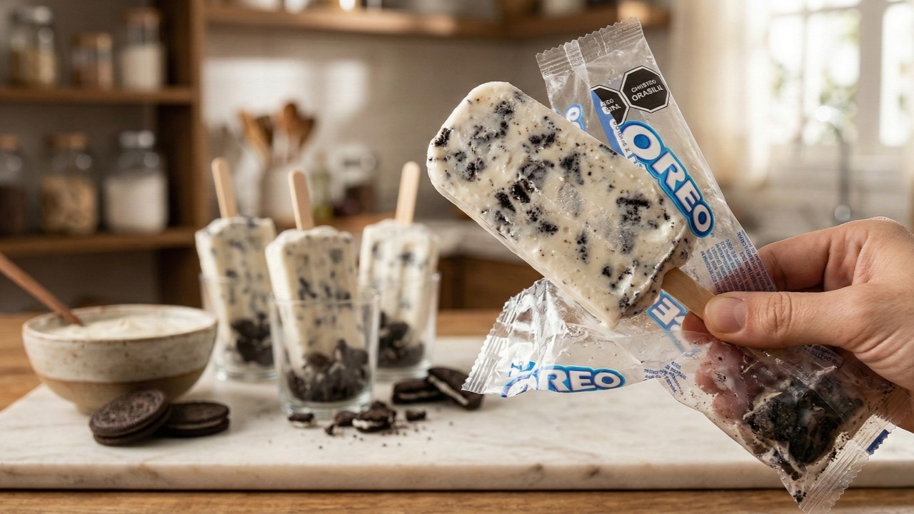 Se você quer um doce gelado fácil, divertido e perfeito para fazer em casa, o picolé de Oreo no pacotinho é a receita ideal. Ele rende 4 porções, leva cerca de 10 minutos de preparo e depois é só deixar firmar no congelador. O segredo é quebrar os biscoitos ainda dentro da embalagem e completar com um creme simples, que congela bem e fica bem cremoso.