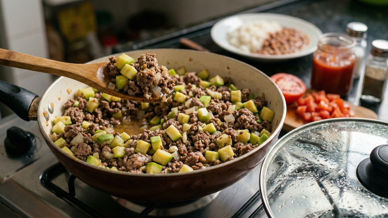 A carne moída dá proteína e sabor, enquanto a abobrinha entra como volume inteligente, cozinhando rápido e deixando o prato macio. Como ela solta água naturalmente, você consegue uma textura úmida sem precisar colocar muito óleo ou fazer molho pesado.
