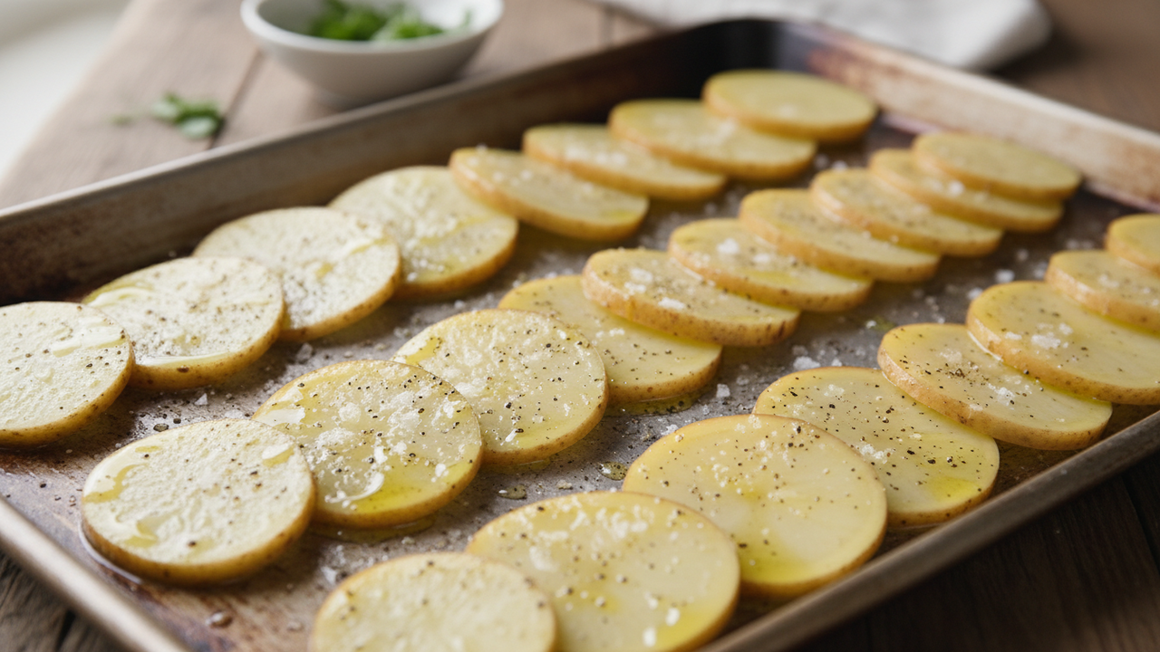 A batata é cortada em fatias finas, organizada lado a lado em uma assadeira e temperada com sal, pimenta e um fio de azeite. O queijo parmesão ralado entra como elemento importante para dar liga e crocância, dourando no forno e formando uma crosta que dispensa o uso de farinha ou espessantes.